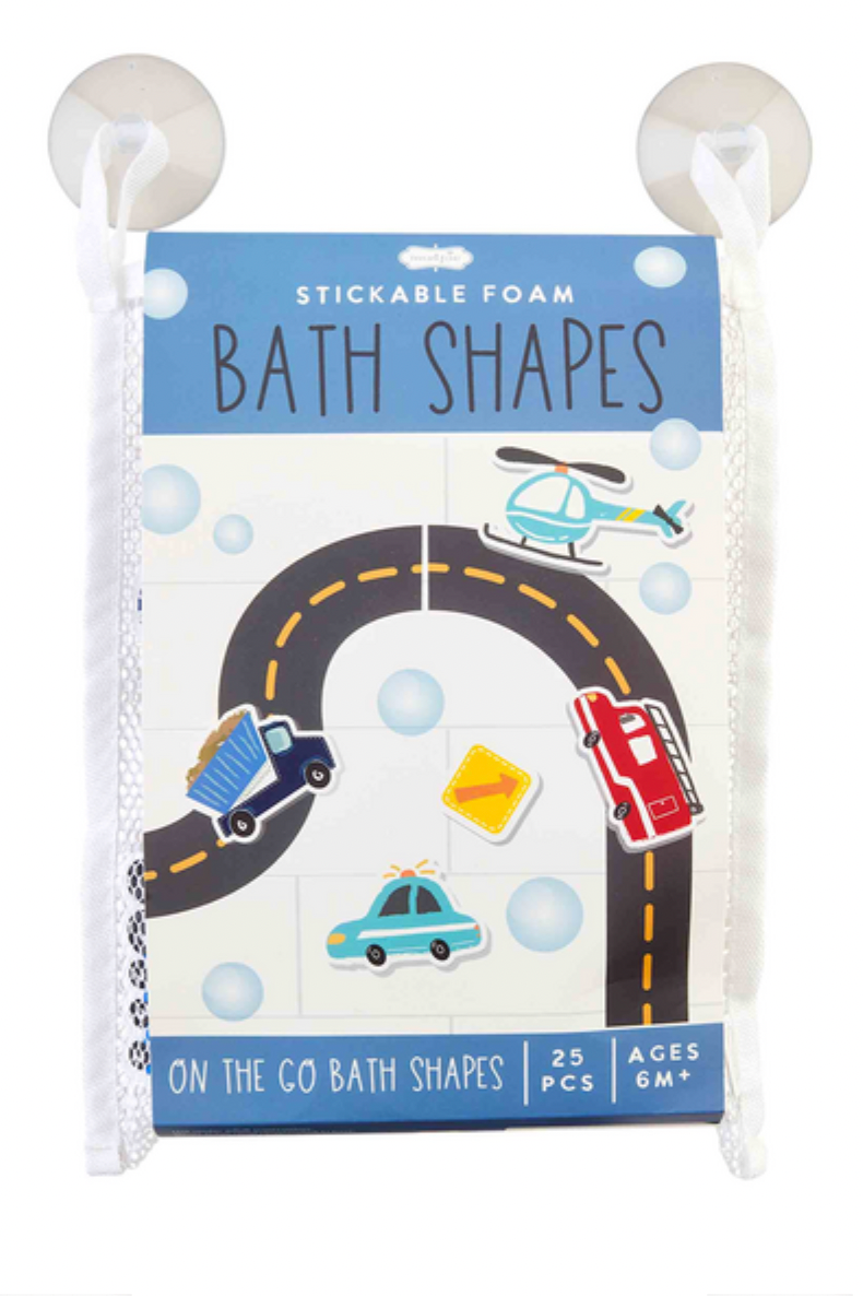 26-piece bath stickable foam shapes. Comes in mesh bag with suction cups.