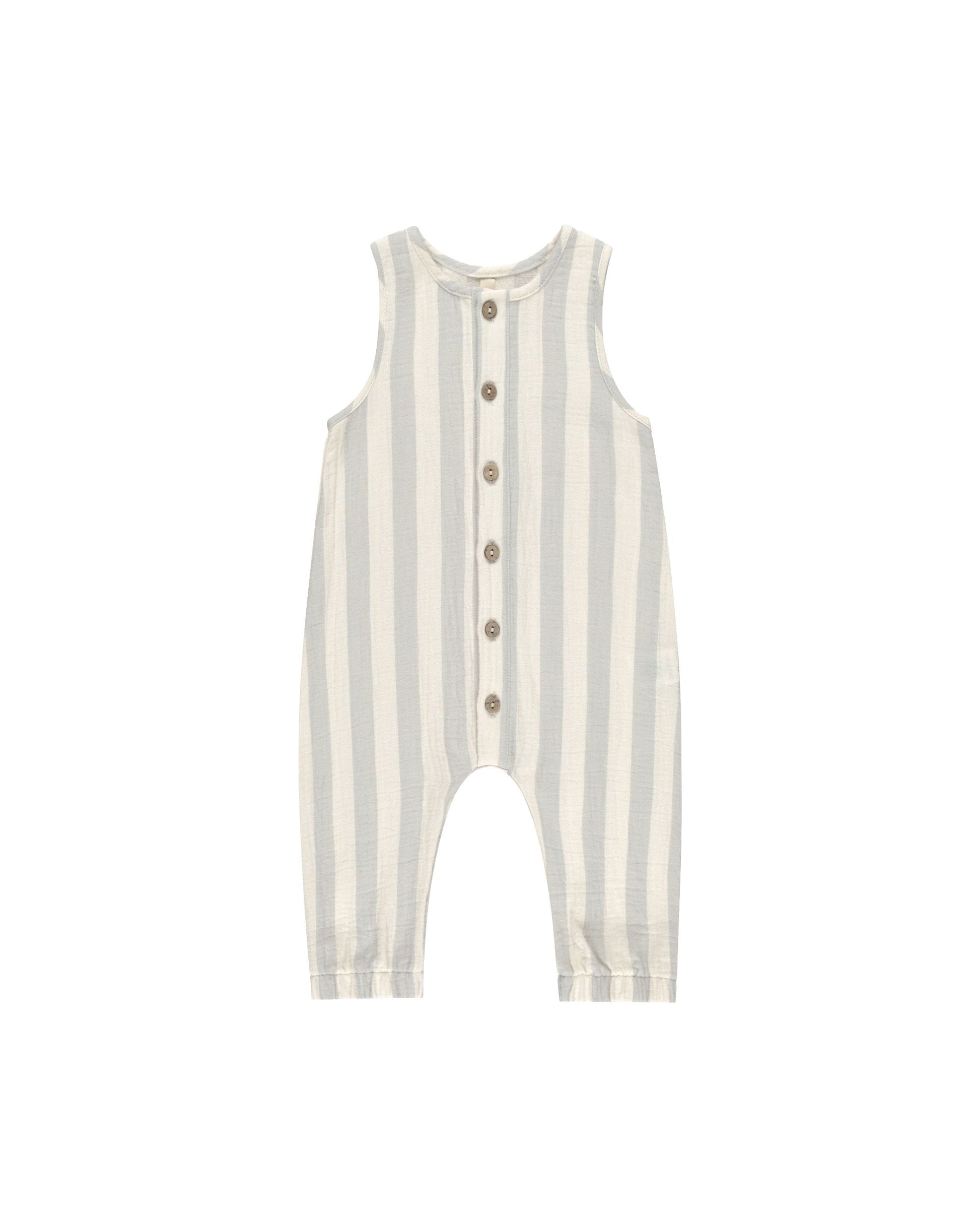 Sleeveless jumpsuit with coconut button front detail. Designed with elastic ankle openings for the perfect fit.