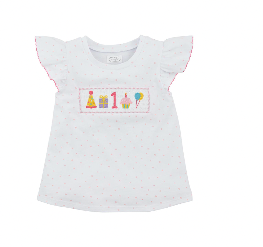 Short sleeve jersey tunic features smocked embroidery chest and flutter sleeves.