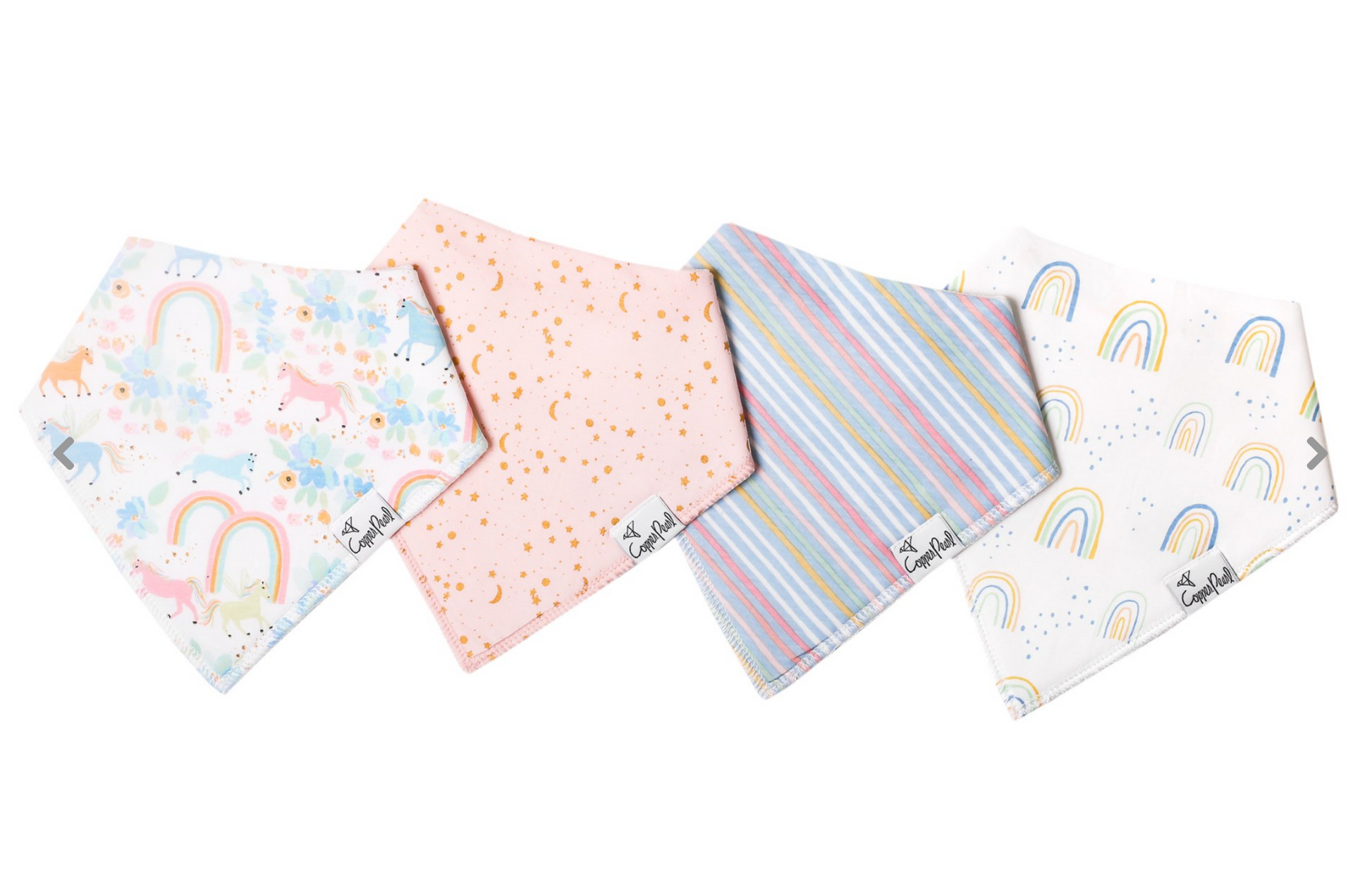Copper Pearl bibs are 100% cotton and 100% CUTE! They are great for drooling and teething babies. The designs are trendy and chic so your baby is sure to be noticed! 2 adjustable snaps make these great for infants and toddlers (3M-24M.)