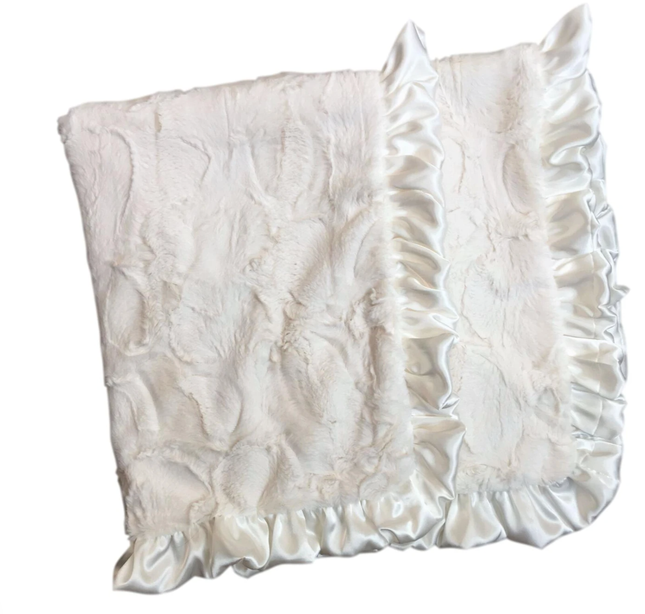 This luxurious plush blanket is framed with a silky satin ruffle. It measures approximately 34" X 34" and is made in the USA.