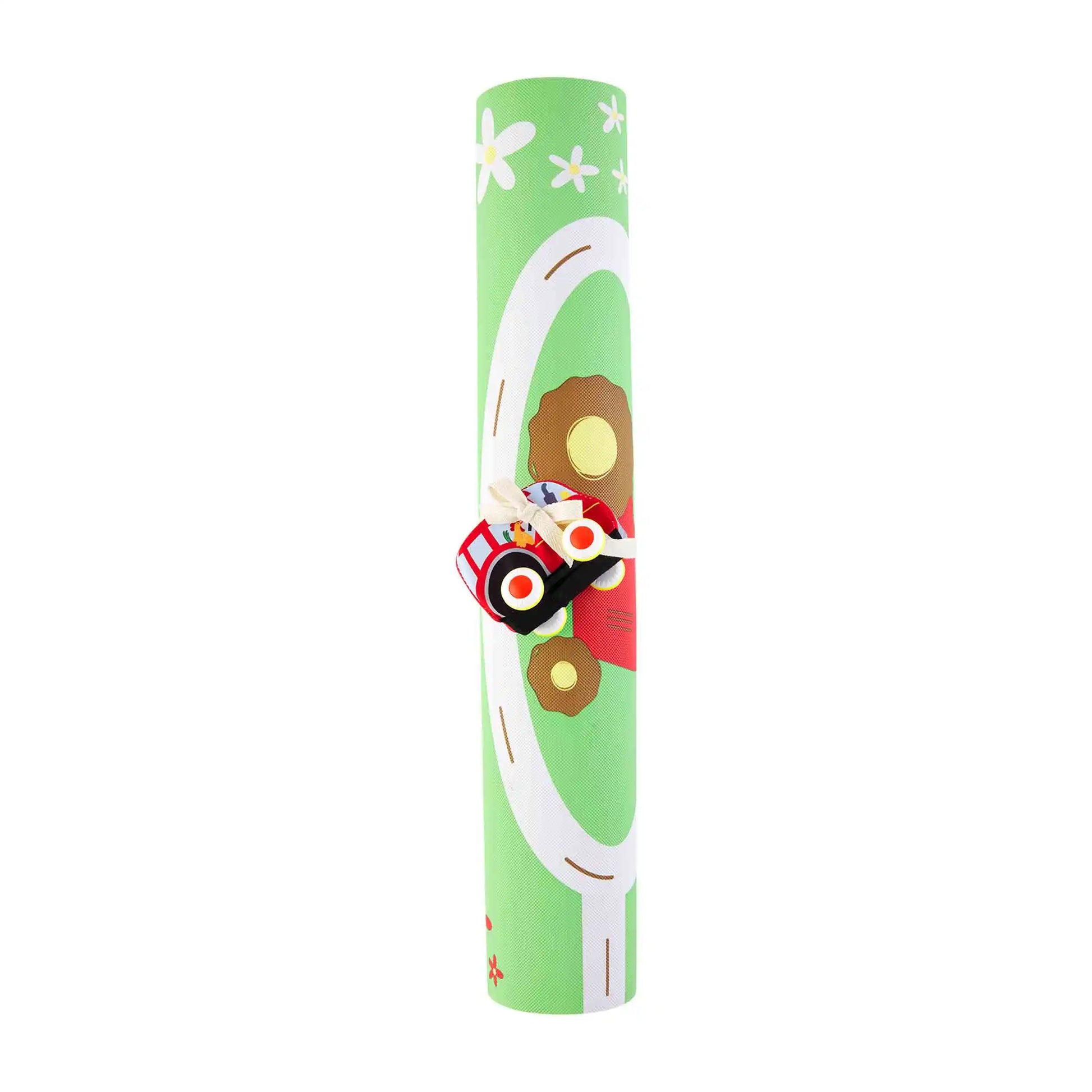 Vroom... pull it back and watch it go with our Tractor Farm Mat Set. The two piece set comes with a foam, soft underfoot, farm scene mat. The scene features various farm animals and plants. The mat set comes with a plush tractor toy that moves after you pull it back.